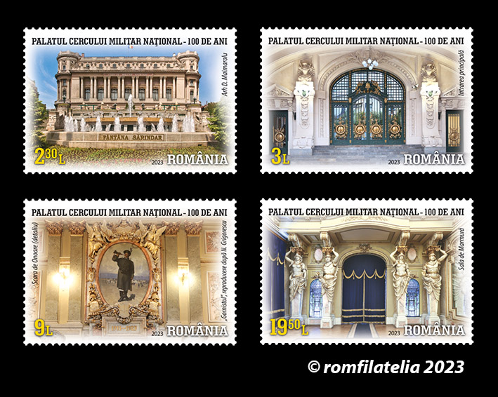 Romfilatelia continuă seria tematicilor dedicate edificiilor cu valoare de simbol ale României, introducând în circulație joi, 2 februarie a.c. emisiunea de mărci poștale Centenarul Palatului Cercului Militar Național, alcătuită din 4 timbre, un bloc de 4 timbre dantelate și un plic prima zi.