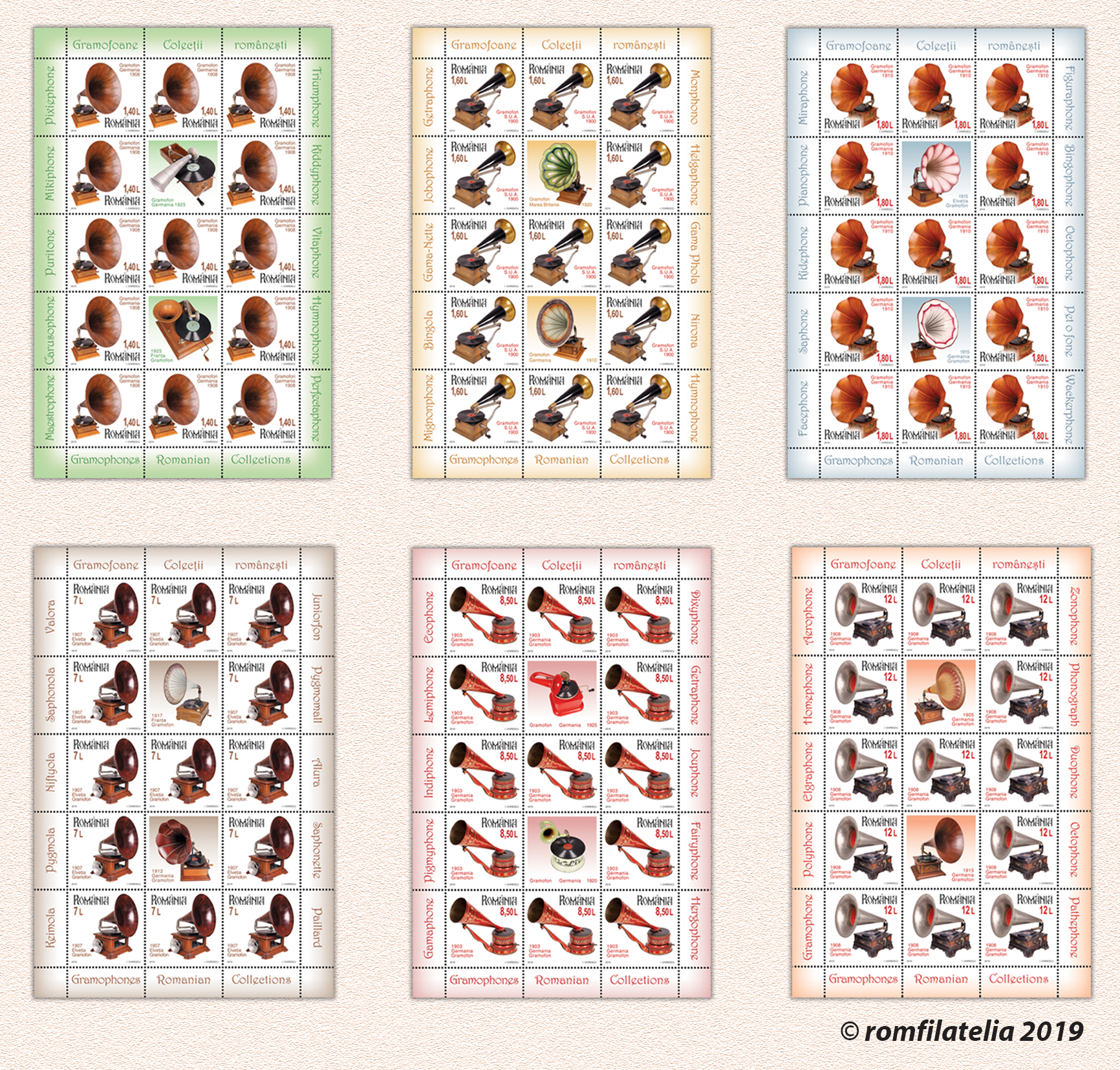 Romfilatelia continuă seria emisiunilor de mărci poștale Colecții românești, de această dată cu tematica Gramofoane. Emisiunea, ce va fi introdusă în circulație Joi, 12 decembrie a.c., este alcătuită din șase timbre și o coliță nedantelată, pe care sunt reprezentate gramofoane de diferite tipuri menite să ilustreze evoluția tehnologiei de redare fonică. Exponatele aparțin unei renumite colecții din București, cea mai mare din lume, certificată de Guinness World Records, în 2016.