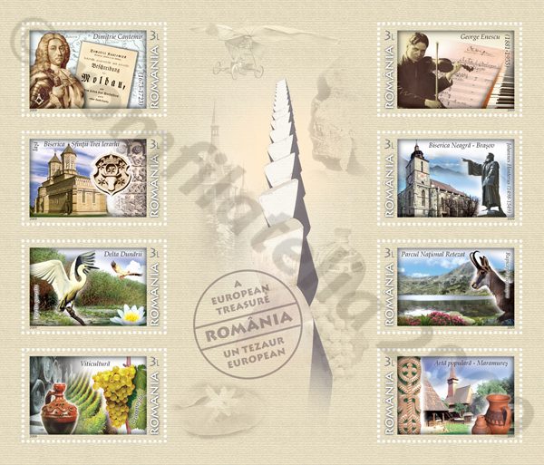 Cele opt mãrci poştale ale emisiunii, fiecare cu valoarea nominalã de 3,00 Lei, ilustreazã bogãţii unice şi autentice cu care România este cunoscutã în toatã lumea.