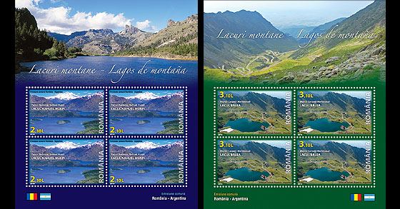 Bloc 4 timbre cu manseta ilustrata Emisiune comunã ROMÂNIA – ARGENTINA / LACURI MONTANE