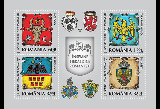 Bloc 4 timbre ÎNSEMNE HERALDICE ROMÂNEȘTI