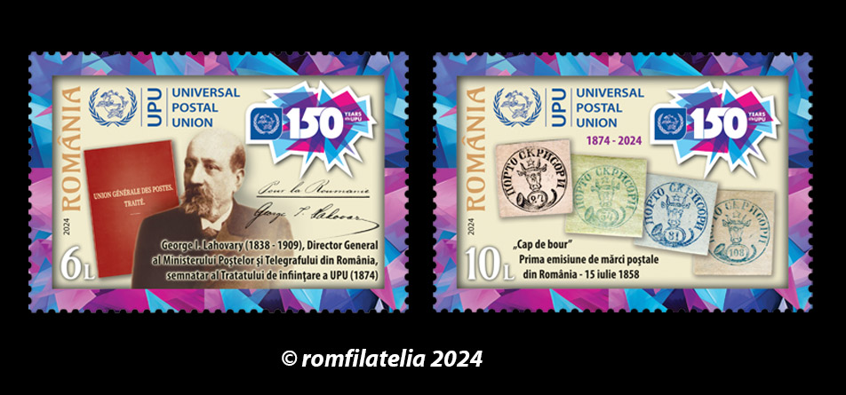 Imaginile celor două mărci poștale ale emisiunii aniversare reproduc primele timbre românești, cunoscutele „Cap de bour” (valoarea nominală de 10 Lei) și o asociere a portretului lui George Lahovary la imaginea copertei mapei oficiale în care se regăseau documentele Tratatului de înființare a Uniunii Generale Poștale (devenită UPU), semnate de delegații participanți la Congresul de la Berna din 1874, printre care se regăsește și semnătura lui George Lahovary (valoarea nominală de 6 Lei). Emblema UPU și sigla aniversară, care marchează împlinirea a 150 de ani de la înființare, completează grafica celor două mărci poștale.