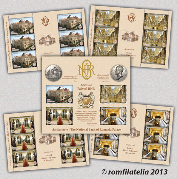 Wishing to promote one of the most representative buildings of the 19th century from Bucharest, a presence that clearly expresses both, the architectural style of the epoch and the prestige of the National Bank of Romania, Romfilatelia introduces into circulation the postage stamps issue Architecture, The National Bank of Romania Palace which set of four postage stamps reproduces images from inside and outside of NBR Palace from Lipscani Street.