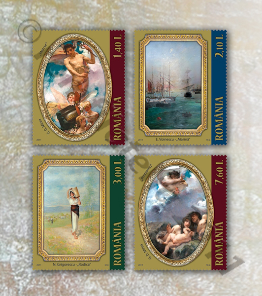 The postage stamps issue that Romfilatelia introduces into circulation, “Art reproductions – Paintings belonging to the National Bank of Romania Treasure”, illustrates on the postage stamps four paintings belonging to Nicolae Grigorescu, Eugeniu Voinescu and George Demetrescu Mirea, exhibited in the Council Chamber of the Bank.