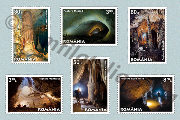 The postage stamps issue “Caves from Romania” that Romfilatelia introduces into circulation illustrates Ursilor, Closani, Muierii, Sura Mare, Vantului and Meziad caves.