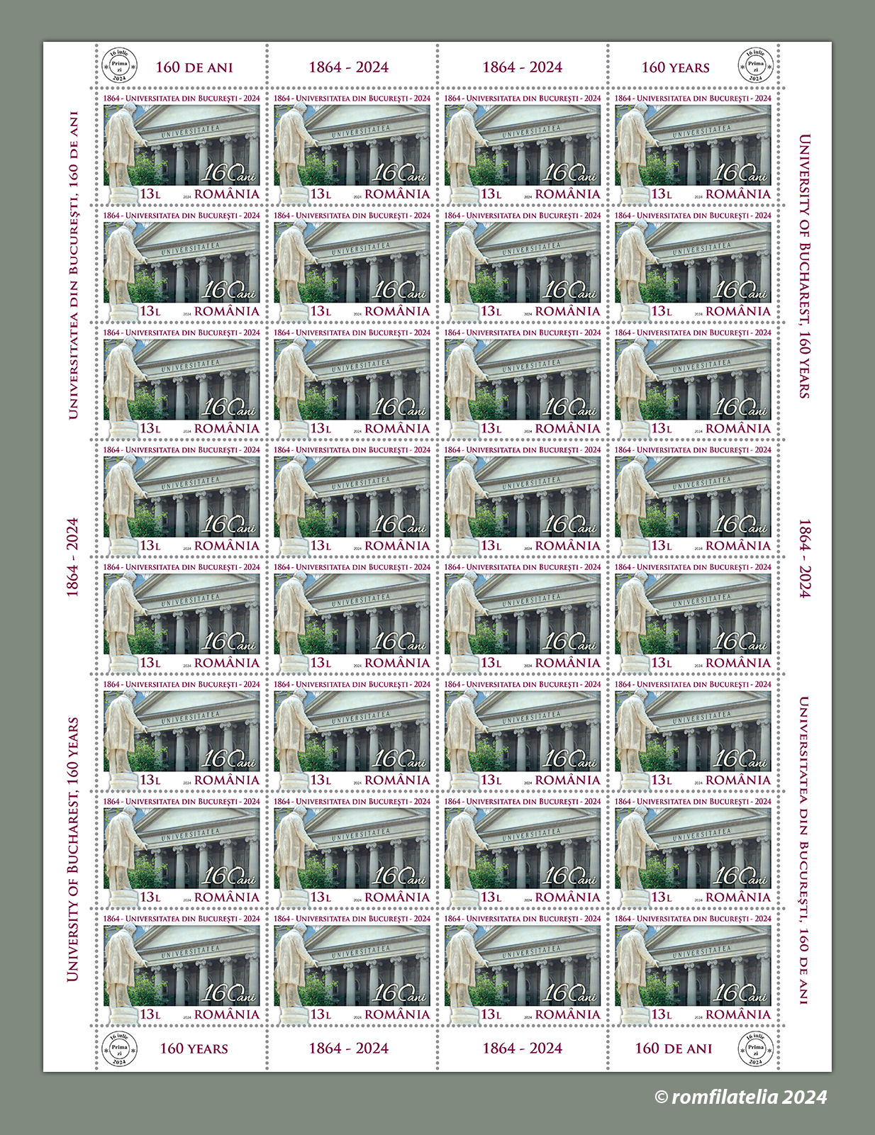 Full sheets of 32 de timbre UNIVERSITATEA DIN BUCUREȘTI, 160 DE ANI