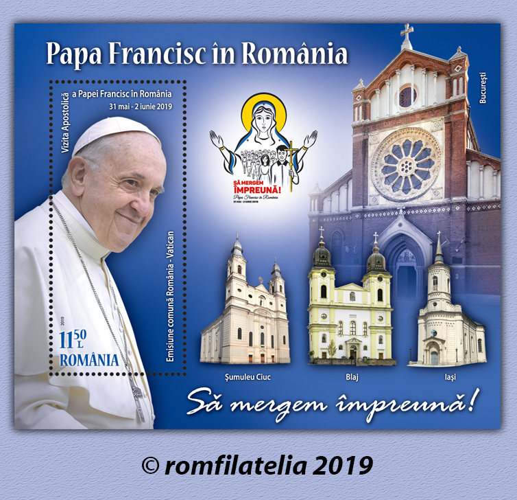 La Romfilatelia, in collaborazione con le Poste dello Stato della Città del Vaticano, metterà in circolazione venerdì, 31 maggio 2019, l’emissione congiunta di francobolli Romania-Vaticano 2019. Il Viaggio Apostolico del Santo Padre Francesco in Romania.