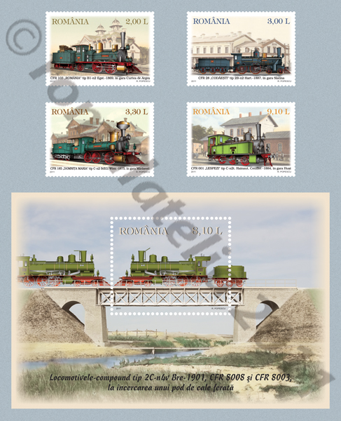 On the postage stamp of the souvenir sheet of the issue, with the face value of 8.10 lei are illustrated the compound-locomotives CFR 8008 and CFR 8003, 2C-n4v Bre.-1901 type, making part of the series CFR 8.001-8.010, delivered in 10 units in the period 1901-1902 by the Italian locomotive factory “Ing. Ernesto Breda & Co.-Stabilimento Meccanico, Milano”. Together withthe tender of 3 axles, they weighed 100 tf. (ton-force) and, in order to run, there were checked, reinforced and tested all the railway bridges on the main routes. The image on the souvenir sheet illustrates even the testing of a bridge, after it had been rebuilt, with two locomotives that had together 200 tf. They were compound-locomotives with four cylinders for express trains and they had the diameter of the driving and coupling wheels of 1,665 mm and a maximum running speed of 113 km/h being distributed to the depots of Bucharest, Iasi and Ploiesti.