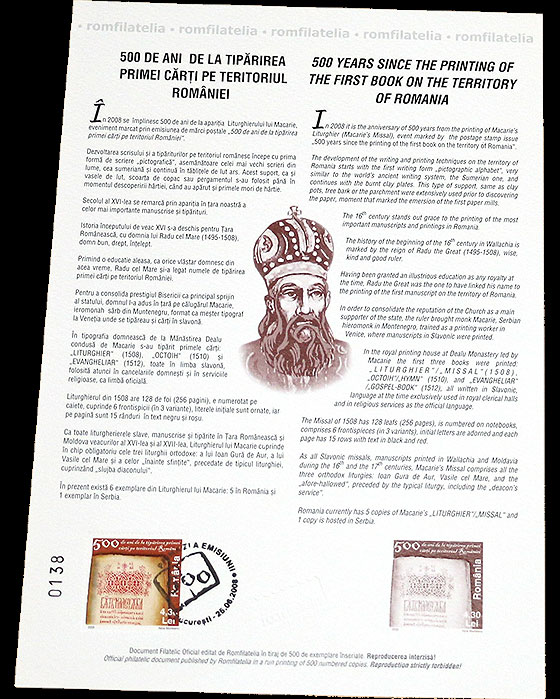 Philatelic Document 500 years since the printing of the first book on the territory of Romania