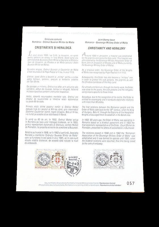 / Philatelic Document CHRISTIANITY AND HERALDRY – Joint Stamp Issue ROMANIA – SOVEREIGN MILITARY ORDER OF MALTA